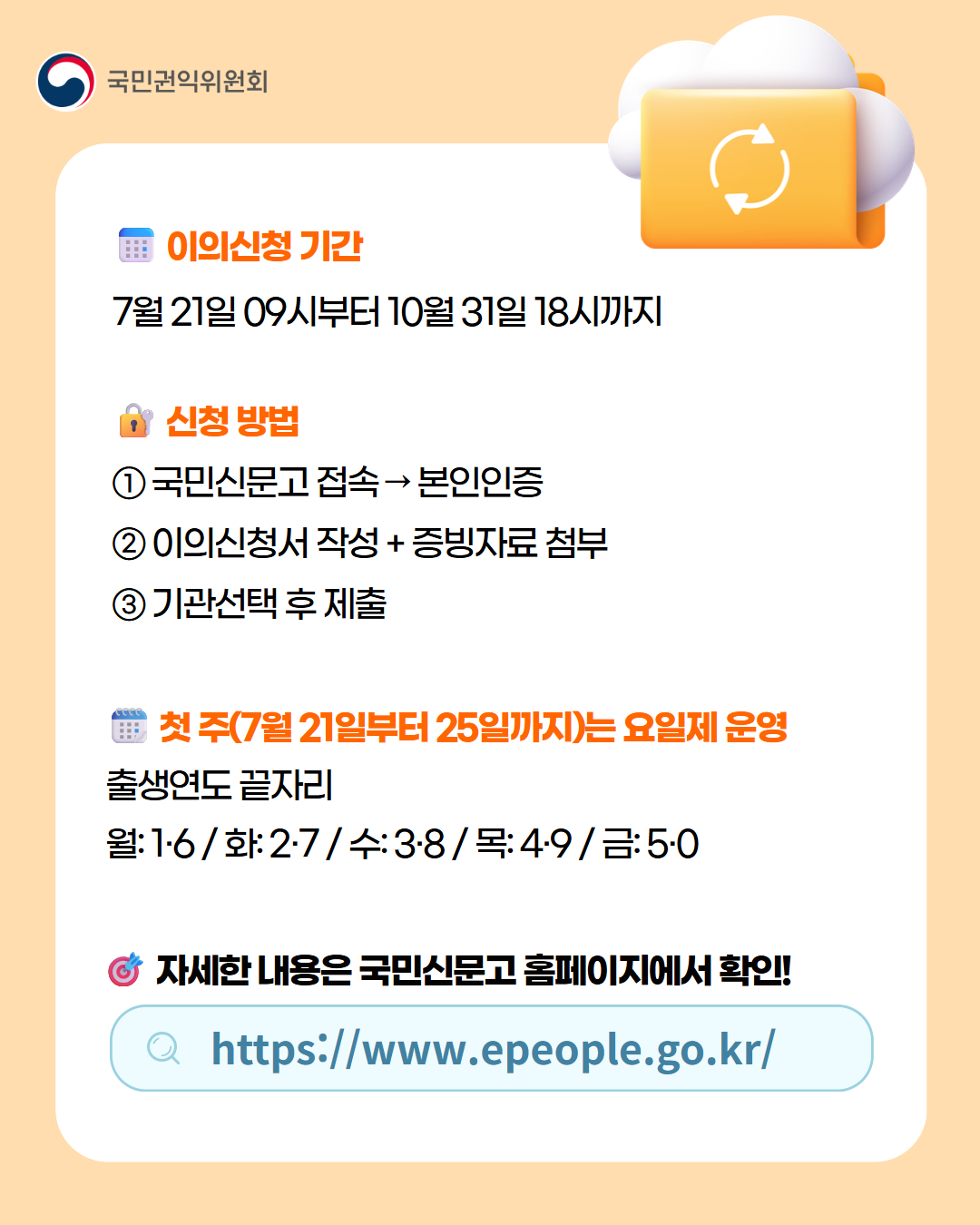 1. 신청 전 필수 체크! '요일제'를 아시나요? 이의신청 역시 초기 혼잡을 막기 위해 **신청 첫 주(7.21 ~ 7.25)에는 5부제(요일제)**가 시행됩니다. 본인의 출생연도 끝자리에 맞는 요일에 신청하셔야 하니, 아래 표를 꼭 확인해 주세요!